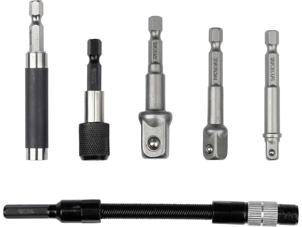 A practical set of adapters for sockets and screwdriver bits designed for use with drills and impact drivers equipped with a standard 1/4" (6.3 mm) HEX chuck. It allows for quick expansion of the power tool's capabilities to work with 1/4", 3/8", and 1/2" sockets, and also facilitates screwing in hard-to-reach places thanks to the flexible extension.