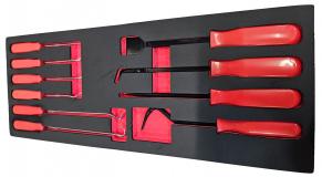 Scraper, hook and pick set suitable for a variety of jobs in the automotive industry and the workshop. hardened and tempered with a black phosphate finish, Fitted with plastic handles.