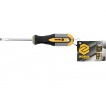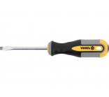 Vorel 60953 flat screwdriver 5x75 mm. Made of CrV chrome vanadium steel. The tip has a satin finish, additionally sanded and magnetized, which allows a secure grip of the screw head. The handle is made of two composite plastic. The hole in the handle allows you to hang a screwdriver.