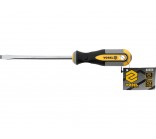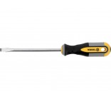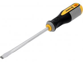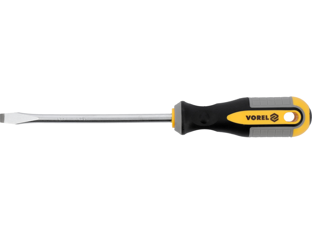 8x150 mm flat blade screwdriver from Vorel 60959. Made of CrV chromium-vanadium steel. The tip has a satin finish, additionally sanded and magnetized, which allows for secure gripping of the bolt head. The handle is made of two composite plastic. The hole in the handle allows the screwdriver to be mounted.