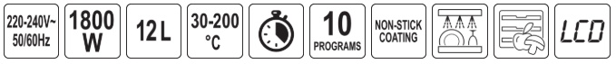 Multifunctional oven (fryer) with a capacity of 12 liters and high power of 1800W. A variety of accessories will make it possible, among other things, to fry French fries, prepare chicken, shashliks, pies, fish and also dry mushrooms and fruits. The device allows you to choose one of 10 automatic programs or select manual temperature and heating time.