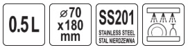 It consists of three components: a top stopper, which can also be used as a measuring cup, a lid with a built-in strainer for pouring prepared drinks, and a lower container with a capacity of 500 ml. The container is 180 mm high and 70 mm in diameter, providing a comfortable and secure grip.