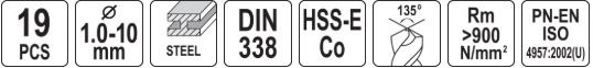 A set of cobalt drills for metal 19 pcs. Resistant to high temperature. The set consists of 19 drills with a diameter [mm]: 1; 1.5; 2; 2.5; 3; 3.5; 4; 4.5; 5; 5.5; 6; 6.5; 7; 7.5; 8; 8.5; 9; 9.5; 10