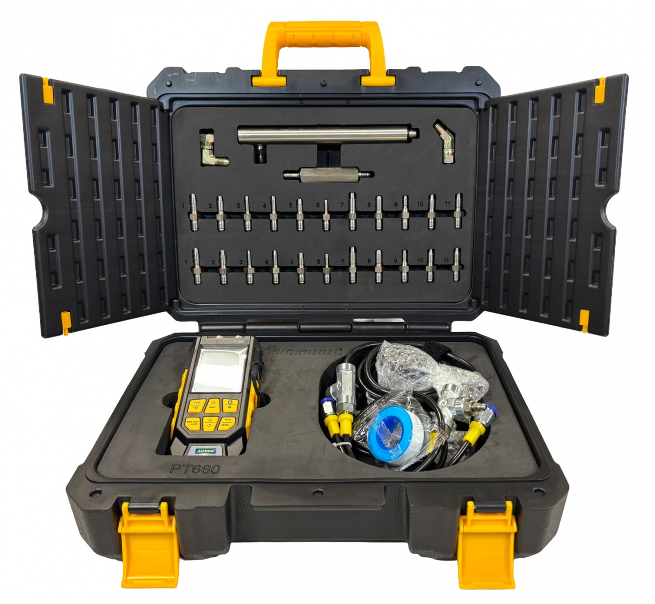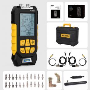 It is an smart brake system pressure tester specifically designed for the automotive repair industry, featuring multiple functions and design characteristics. It has a pressure measurement range of 0-210 bar and provides various adapters. The device can simultaneously measure the pressure of the front and rear wheel brake systems, providing comprehensive monitoring of the brake system's condition. Additionally, it features an atmospheric pressure calibration function, which allows for automatic calibration based on ambient air pressure. With a 3-inch backlit display and button lights, it ensures clear visibility in both bright and dim environments. Utilizing advanced pressure sensor technology, the measurement accuracy can reach ±1% FS, with a resolution of 0.1 bar. It allows for precise measurement of pressure changes in the braking system, helping technicians promptly identify pressure abnormalities and ensuring the vehicle operates stably and safely during driving.