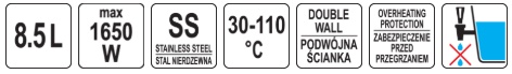 The boiler has an adjustable operating range in the range of 30 ~ 110 ° C. Control lights indicate heating and maintaining the temperature. Outside the boiler there is a water level indicator with a scale in liters. On both sides of the cooker there are strong, cool carrying handles. The TWIST LOCK system closes the lid tightly. The plastic tap prevents dripping.