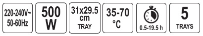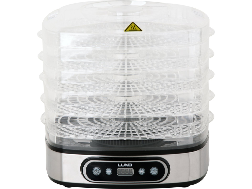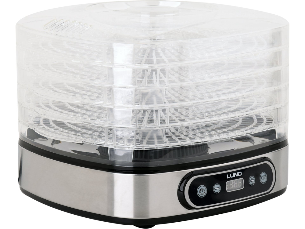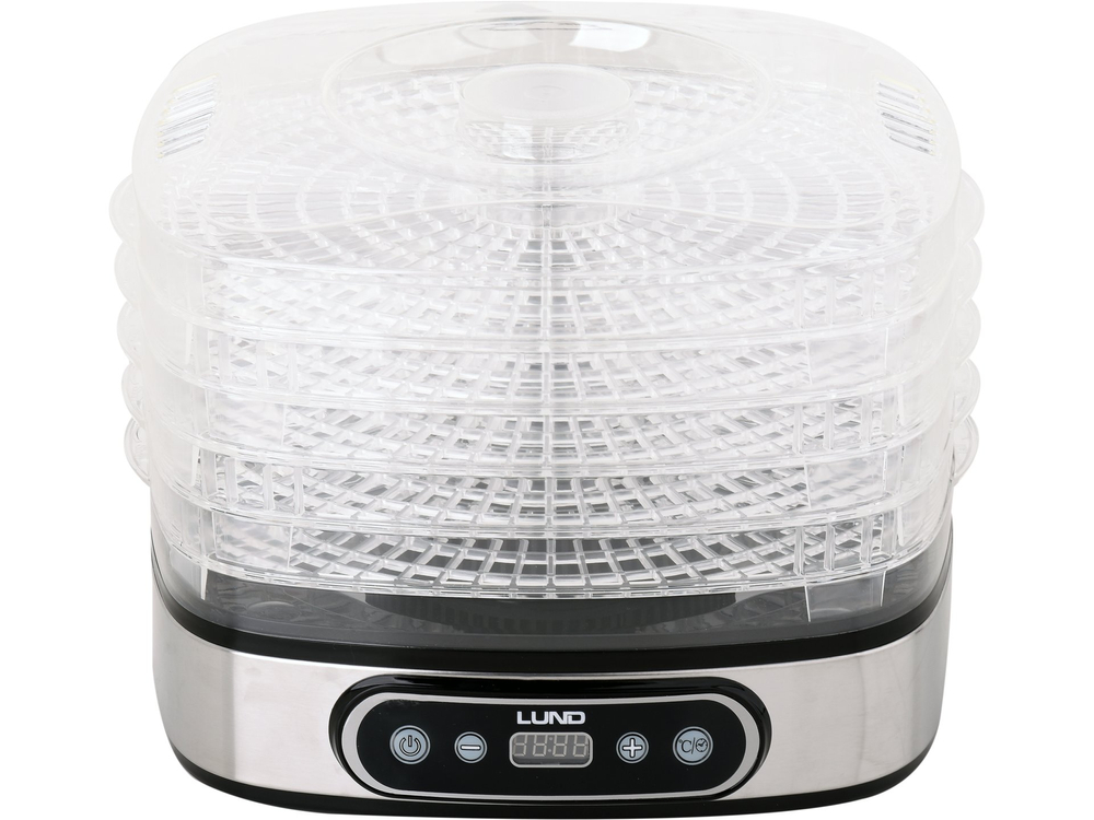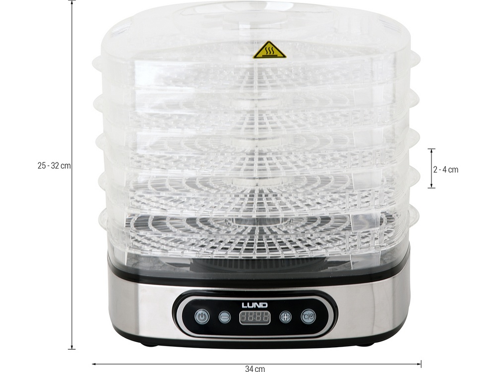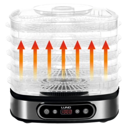 LUND electric dryer designed for drying food products: fruits, vegetables, mushrooms, flowers, herbs, meats and fish. It preserves the nutritional and taste values of food, preserving it for a period of several months. Thanks to the built-in timer, it is possible to program the drying between 0.5 and 19.5 hours.