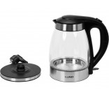 Glass electric kettle with an internal LED ring that illuminates blue while boiling. The kettle's high power ensures faster water heating. Power: 1850-2200 W