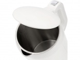 The kettle features a convenient lid opening system using a button in the handle and a wide filling spout for easy filling.