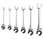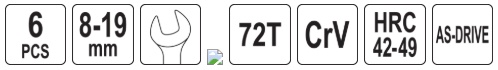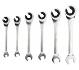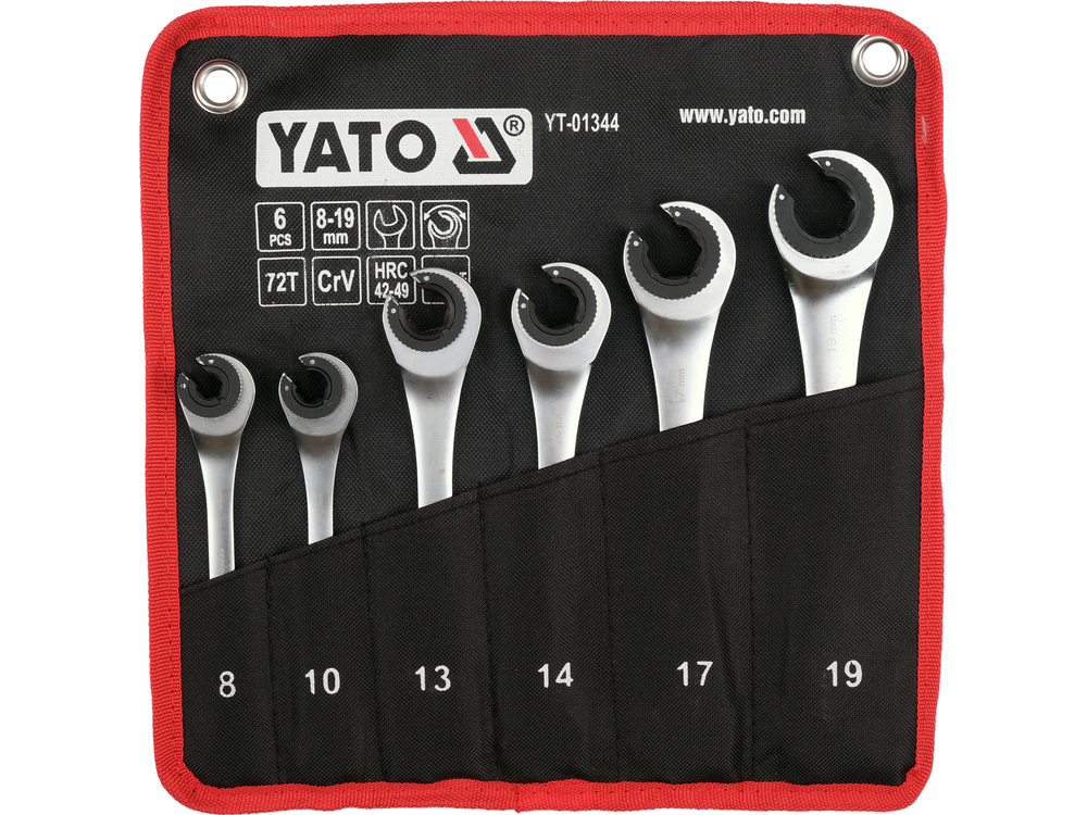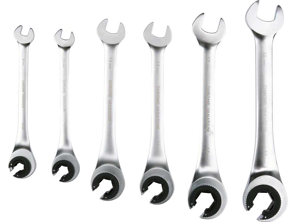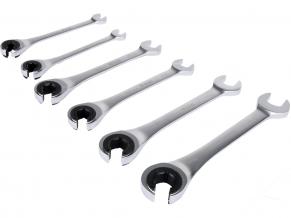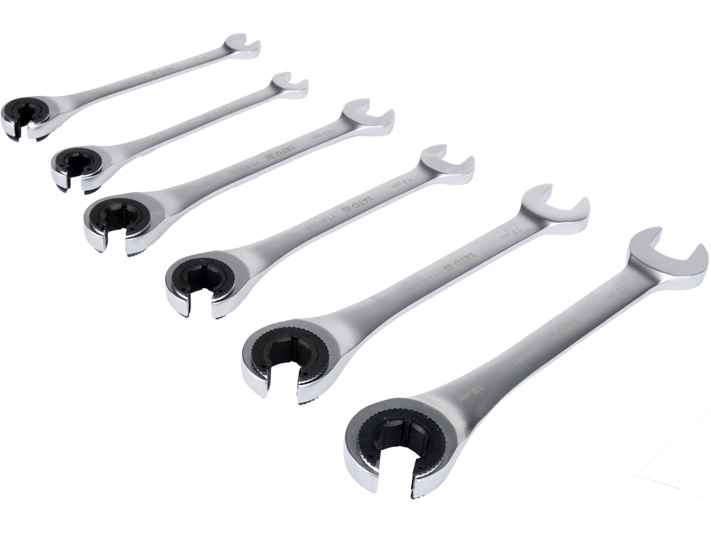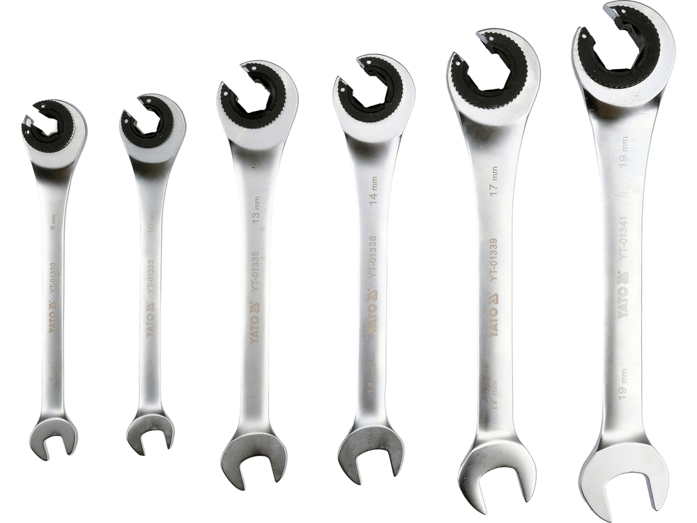 Set of semi-open ratchet wrenches designed for quick loosening and tightening of screw connections, especially in areas with limited working space. The use of a 72-tooth ratchet mechanism allows for a small working angle and eliminates the need to remove the wrench from the nut with each movement, which speeds up vehicle servicing, installation assembly, or mechanical work.