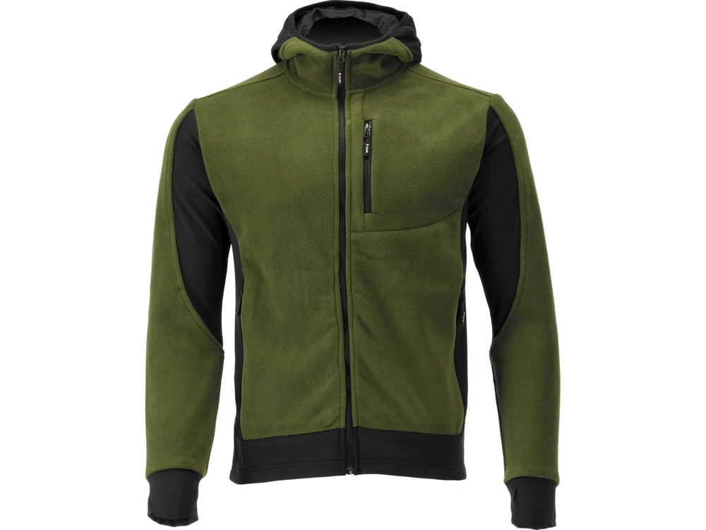 Fleece jacket with hood, functional zones and five pockets. It combines the characteristics of workwear with the comfort and freedom of movement known from outdoor clothing.