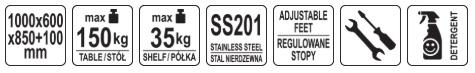 The table top is made of 0.8 mm thick solid sheet metal with additional reinforcing profiles. In addition, the top is reinforced from the bottom with a 20mm thick laminated wooden board, which stiffens and dampens it, and at the same time is resistant to moisture. Thanks to this, the table top can reach a load capacity of up to 150 kg.