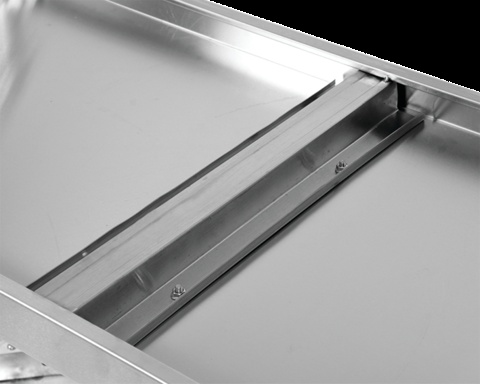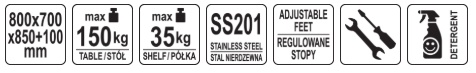 The table top is made of 0.8 mm thick solid sheet metal with additional reinforcing profiles. In addition, the top is reinforced from the bottom with a 20mm thick laminated wooden board, which stiffens and dampens it, and at the same time is resistant to moisture. Thanks to this, the table top can reach a load capacity of up to 150 kg.