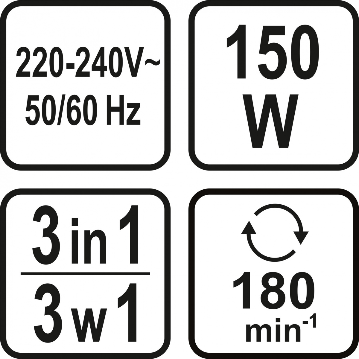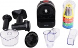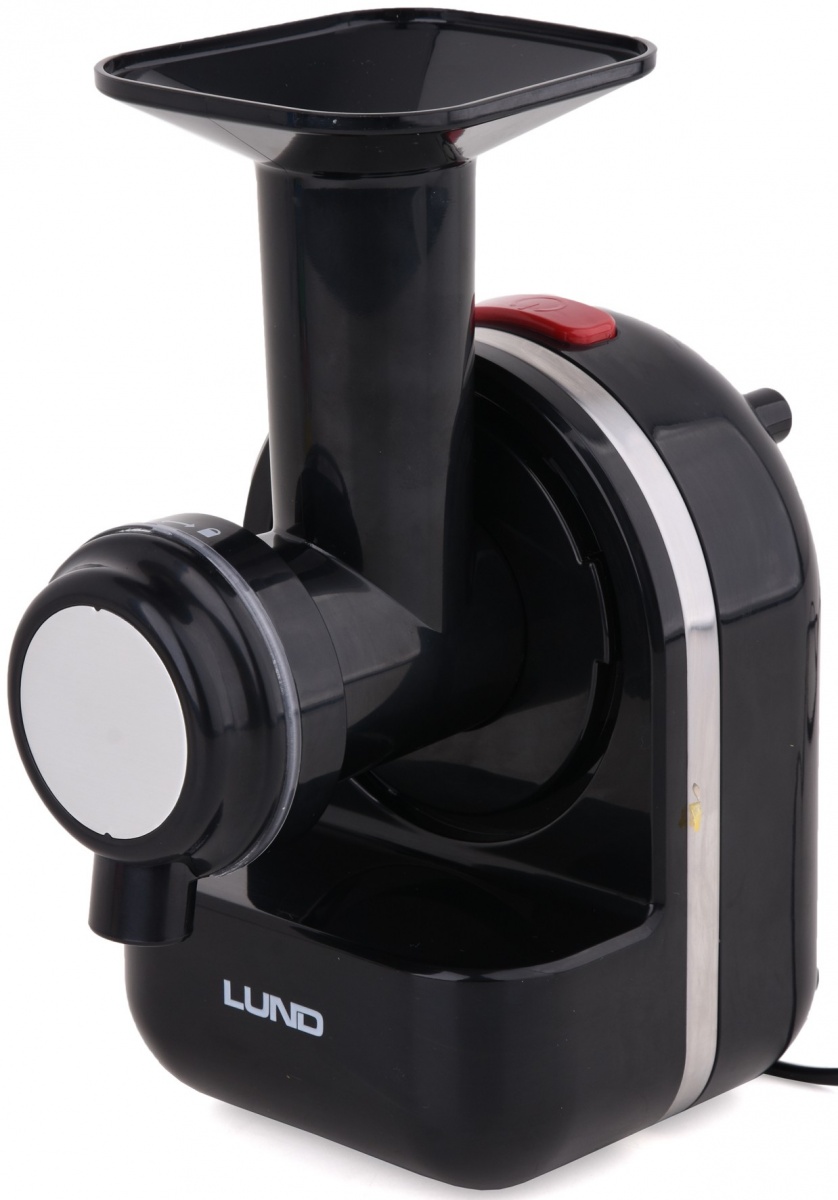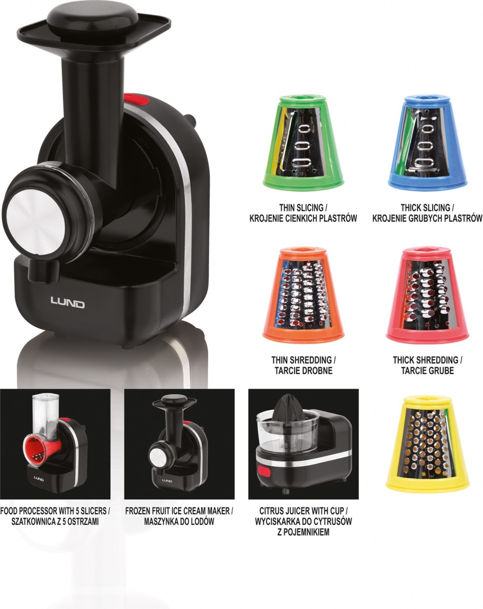 The multifunctional 3-in-1 food processor allows slicing and grinding vegetables and fruits, preparing delicious juice and sorbet. The slicer has as many as 5 replaceable graters, which will help to prepare, among others, salad or potato pancakes. The ice cream maker will properly crush and form frozen fruit.