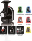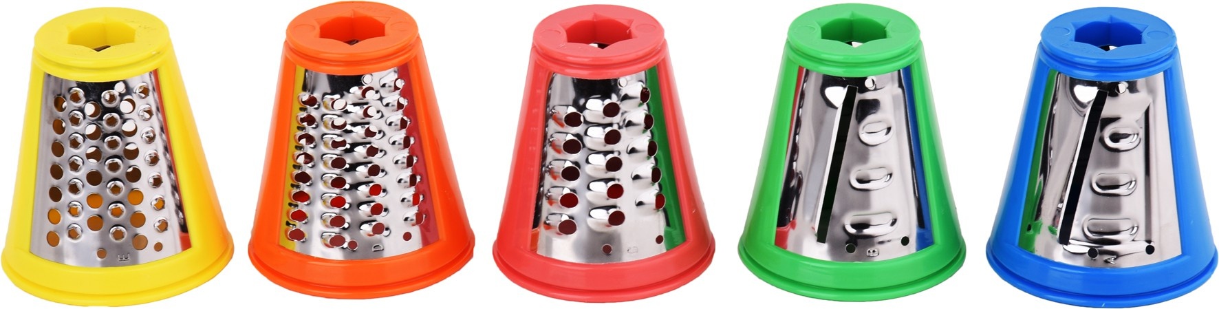 SLICER - a slicer with an inlet hole and a pusher. Includes up to 5 different graters. The tips are easy to change, they can also be washed in the dishwasher.