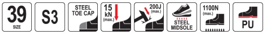 steel toe cap resistant to impact with energy up to 200 J and compression up to 15 kN