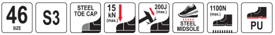steel toe cap resistant to impact with energy up to 200 J and compression up to 15 kN
