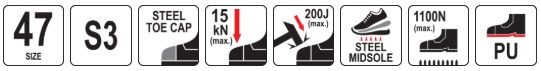 steel toe cap resistant to impact with energy up to 200 J and compression up to 15 kN