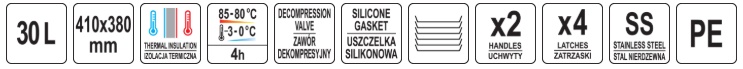 Between the tank and the walls a special heat-insulating layer is placed, keeping the temperature for many hours. In the case of hot content the loss of heat is only 5 ° C within 4h. In case of cold content, the temperature increase is only 3 ° C within 4h. The thermal insulation performance of the container classifies it as the most effective food catering tool in the industry.