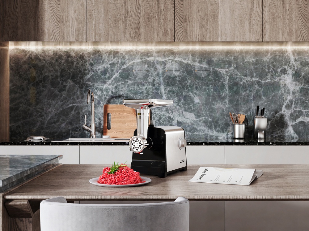 The grinder is made of durable stainless steel and sturdy ABS material, ensuring the solidity and long life of the device. The metal tray makes it easier to feed meat for grinding, and the stainless steel blade guarantees precise cutting for a long time. Safe and comfortable operation is enhanced by the safety switch, reverse function, and non-slip stabilizing feet during operation.