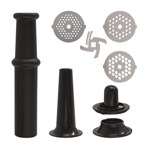 included in the set: tray, blade, 3 grinding discs (3 mm, 5 mm, 7 mm in diameter), sausage filling attachment, 2 kebbe attachments, and pusher