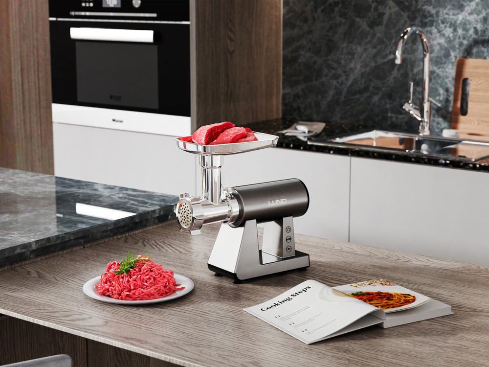 The grinder is equipped with a reverse function, which facilitates cleaning and unblocking the meat, as well as a safety switch protecting the user from accidental start-up. Non-slip feet ensure stability during operation, and the compact design weighing 3 kg makes the device convenient to carry and store.