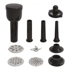 set includes: tray, blade, 3 grinding discs (4 mm, 7 mm, pusher), 3 sausage filling nozzles (14 mm, 20 mm, 22 mm), 3 kebbe attachments, and pusher