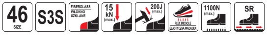 fiberglass toecap, lightweight, does not absorb ambient temperature, resistant to impacts with an energy of up to 200 J and crushing up to 15 kN