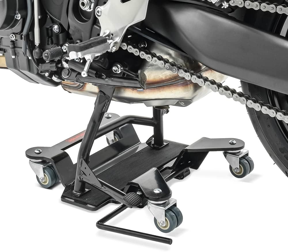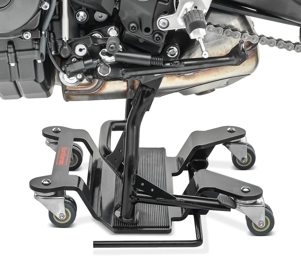 Built with durable steel-plate construction, this dolly can support motorcycles weighing up to 550kgs