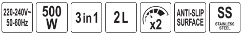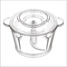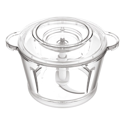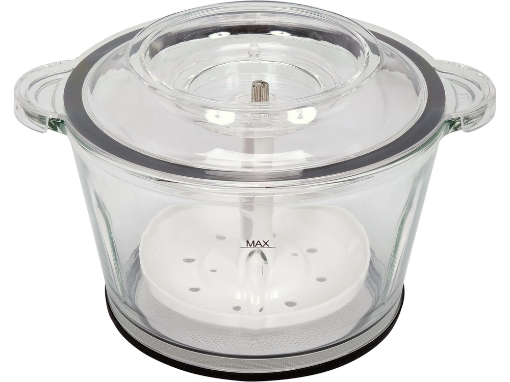 Set contents: chopper, 2L glass bowl with cover, attachment with 4 double-layered blades (stainless steel SS420), garlic peeling attachment, egg white whipping attachment, scraper