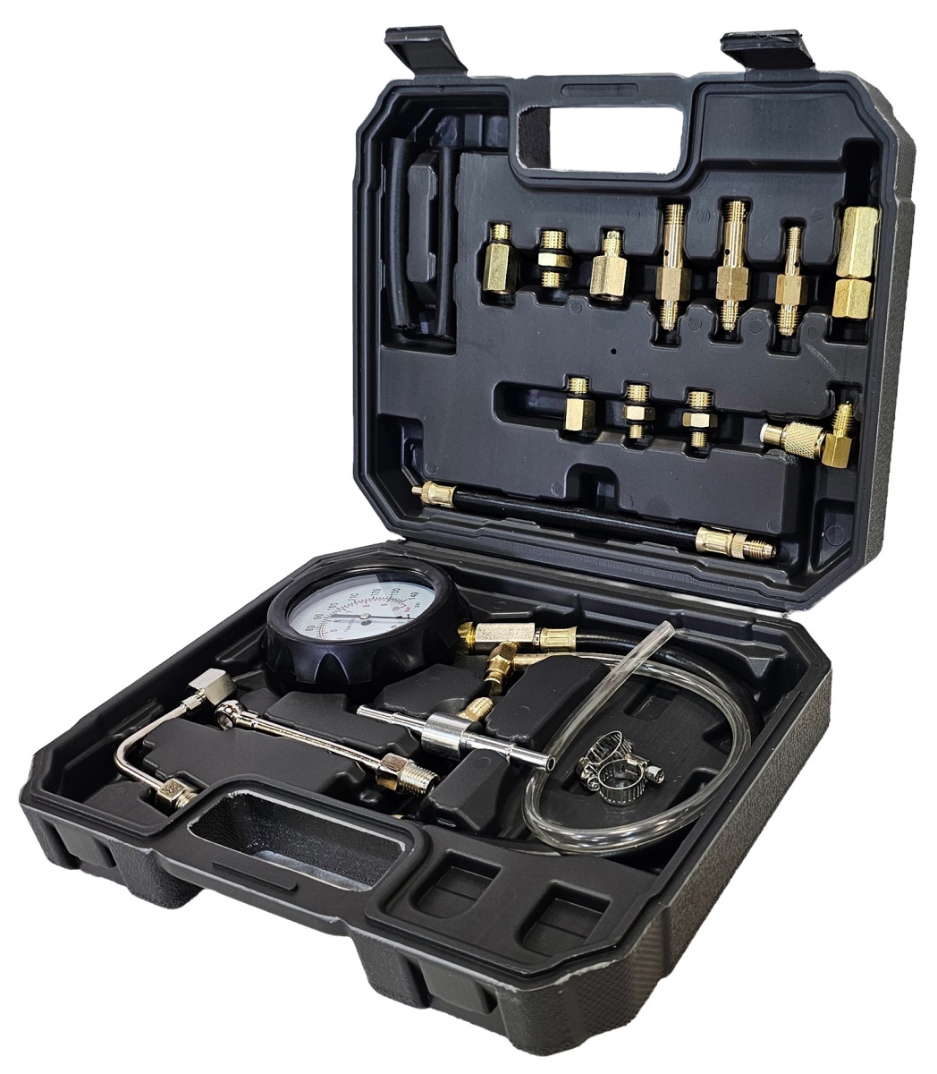 Item size:49*8*3.5cm Carrying Case size:36*26*7cm Gauge Calibration: 0-140 PSI (0-10 Bar) Adapter Sizes: M10 / M12 / M14 Condition: 100% Brand New Package Includes: Pressure Gauge Tester Kit with Carrying Case Includes a variety of hoses, fittings, and clamps