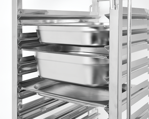 MATERIAL: S/S 201; M SHAPE; RAIL THICKNESS: 0.9MM; RAIL DISTANCE: 80MM; TUBE THICKNESS: 0.9MM, MAX LOAD: 40KG PER SHELF; 4 TPR SWIVEL CASTORS, DIA.: 100MM X W:25MM 2 WITH BRAKES EACH WHEEL WITH BUMPER, WITH STEEL LOCKER FOR EACH OPEN SIDE; COLOUR: S/S; DIMENSIONS: 380*550*1700MM WITH 15 PAN 1/1