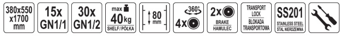 The YATO transport truck, measuring 380x550x1700 mm, allows the transport of 15 GN 1/1 containers or 30 GN 1/2 containers.
