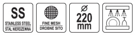 Yato brand sifter. It has a diameter of 220 mm and a depth of 60 mm. The sieve has a fine mesh size of 1 mm.