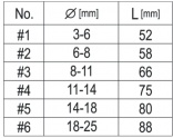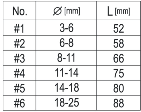 3-6 | 6-8 | 8-11 | 11-14 | 14-18 | 18-25 mm