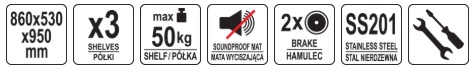 Three large shelves measuring 820x500 mm are finished with a special edge that secures the transported products by slipping during transport.