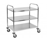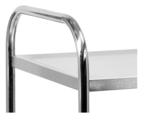 MATERIAL OF SHELF: S/S 201, MATERIAL OF TUBE: S/S 201, ROUND TUBE, DIA. OF TUBE: 25MM, THICKNESS: 0.9MM, 2 SHELFS, SHELF THICKNESS: 0.8MM; SHELF DISTANCE: 270MM, MAX LOAD: 50KG PER SHELF, 4 TPR SWIVEL CASTERS, DIA.100MM X W25MM, 2 WITH BRAKES, EACH WHE BUMPER; COLOUR: S/S; DIMENSIONS: 860*530*950MM