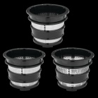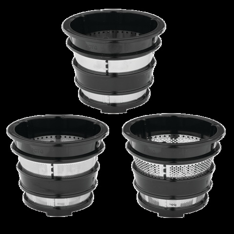 juicer, juice container, pulp container, filter with small holes for thin juice, filter with large mesh for thick juice, filter without meshes for frozen fruit,
