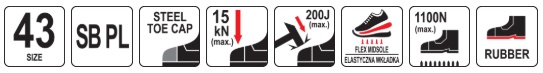 steel toecap resistant to impact with energy up to 200 J and crushing up to 15 kN