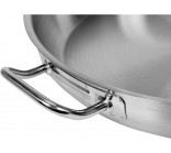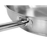 Professional stainless steel induction frying pan, 32 cm in diameter, with a capacity of 4.0 l. The bottom diameter is 258/264 mm (external/internal). Handle length: 270 mm. The YATO Professional Kitchen Equipment frying pan is designed for professional use in the catering industry. It is perfect for frying all types of food. It is made of high-quality 21/0 stainless steel, developed specifically for use in catering. The most important advantage of pans made from this type of steel is their 30% greater heat conductivity compared to standard pans made from 304 steel. They are also characterized by increased resistance to mechanical damage and the effects of organic acids and detergents. This makes them dishwasher safe and resistant to intense scrubbing. Importantly, pans made from 21/0 steel are free of manganese and nickel, which are harmful to human health. The special design of the capsule bottom distributes heat evenly across the entire bottom surface, increasing heat utilization and cooking efficiency. This directly translates into quality and comfort for the cook. This solution also reduces the risk of food burning. A special ferromagnetic insert in the bottom allows YATO pans to be used on all types of cooktops, including: - electric - induction - gas - ceramic. The pan's sides are made of thick steel, retaining heat longer than standard 304 stainless steel cookware. YATO pans feature exceptionally robust, stay-cool, and securely attached handles. This ensures safety and long-lasting durability. Designed for professional use in the catering industry, it is perfect for frying all types of food.