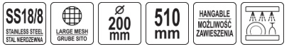 Yato slotted spoon. The outer diameter of the slotted spoon is 200 mm, and the reinforced handle with a grip is 33 cm long. It is made of 4 mm thick wire, making the spoon very durable. The strainer has coarse mesh measuring 5 mm x 5 mm.