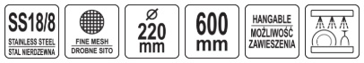 Yato slotted spoon with a diameter of 220 mm. It has a reinforcing rim. The reinforced 40 cm handle is made of 4 mm thick wire, making the spoon very durable. The slotted spoon has fine meshes of 2 mm x 2 mm.