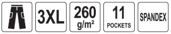 Work trousers from the SERWAL range with inserts in 4way stretch fabric. Eleven pockets, including a multifunctional pocket with a concealed zip, ideal for a wallet or phone. Possibility to shorten the trousers by approximately 4 cm with sewn-in snap buttons. Numerous stitches in the areas most vulnerable to tearing.