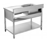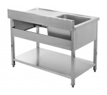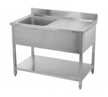 This catering table with a shelf and single-bowl sink is a practical workstation designed for professional kitchens, catering facilities, and food service establishments. It combines the functions of a worktop and a wash area in a single structure, streamlining workflow and enabling optimal use of available space.