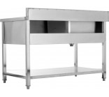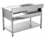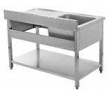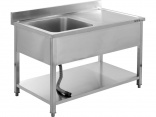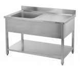 This catering table with a shelf and single-bowl sink is a practical workstation designed for professional kitchens, catering facilities, and food service establishments. It combines the functions of a worktop and a washing area in a single structure, streamlining workflow and enabling optimal use of available space.