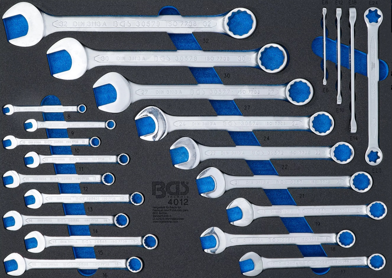 combination spanners: 8 - 9 - 10 - 11 - 12 - 13 - 14 - 15 - 16 - 17 - 18 - 19 - 21 - 22 - 24 - 27 - 30 - 32 mm