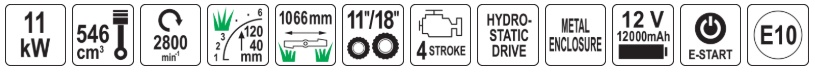 Equipped with a powerful 546 cm³ Loncin LC1P91F-1 engine, the mower guarantees high performance and reliability. The hydraulic transmission facilitates a smooth ride, and the electric start ensures trouble-free starting of the machine. The maximum cutting width of 1066 mm and the 6-stage cutting height adjustment (40-120 mm) allow precise adjustment to lawn conditions.