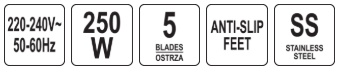 250 W power efficiently and quickly chops even harder vegetables