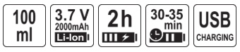 Powered by a 3.7 V Li-Ion battery (2000 mAh), it provides up to 35 minutes of operation on a single charge, allowing you to wash several windows without interruption. After finishing work, the battery can be charged via a USB port, and within 2 hours, the washer is ready to use again.
