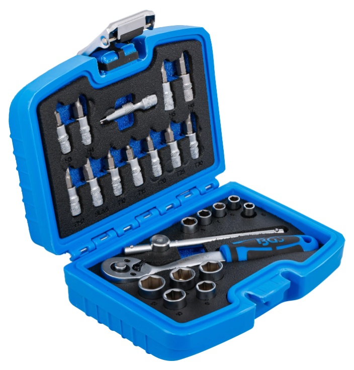 in a compact blow mould case with foam tray for a good overview and safe storage and transportation