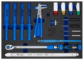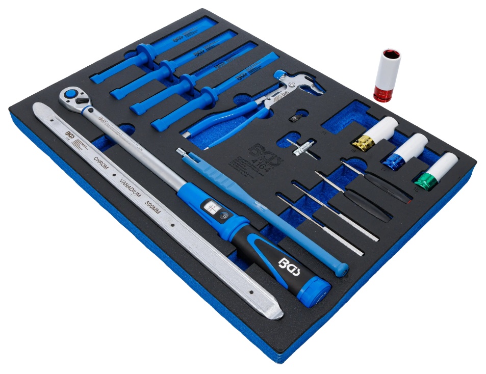 the tools are protected in the hard foam tray and are stowed in the recesses in a non-slip manner